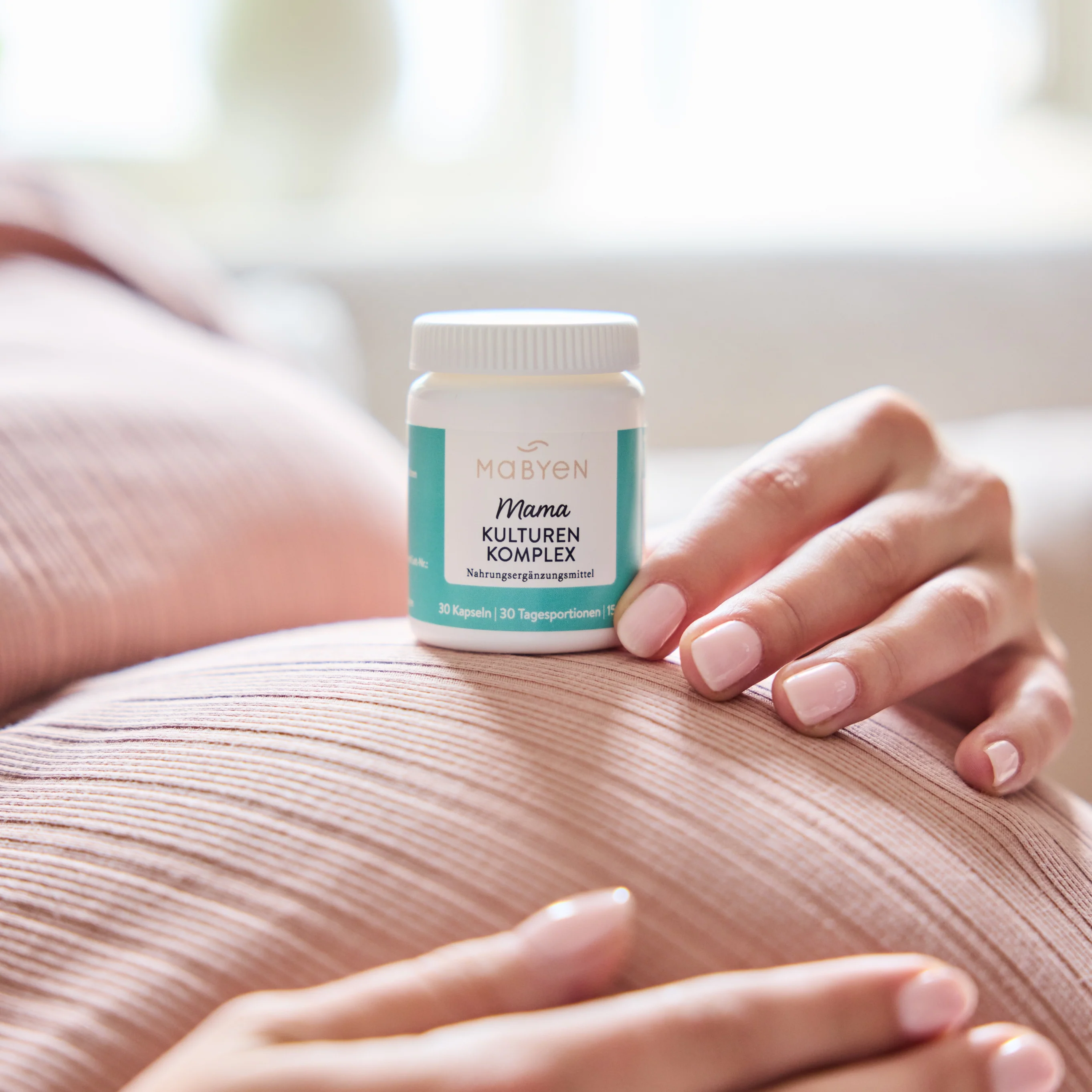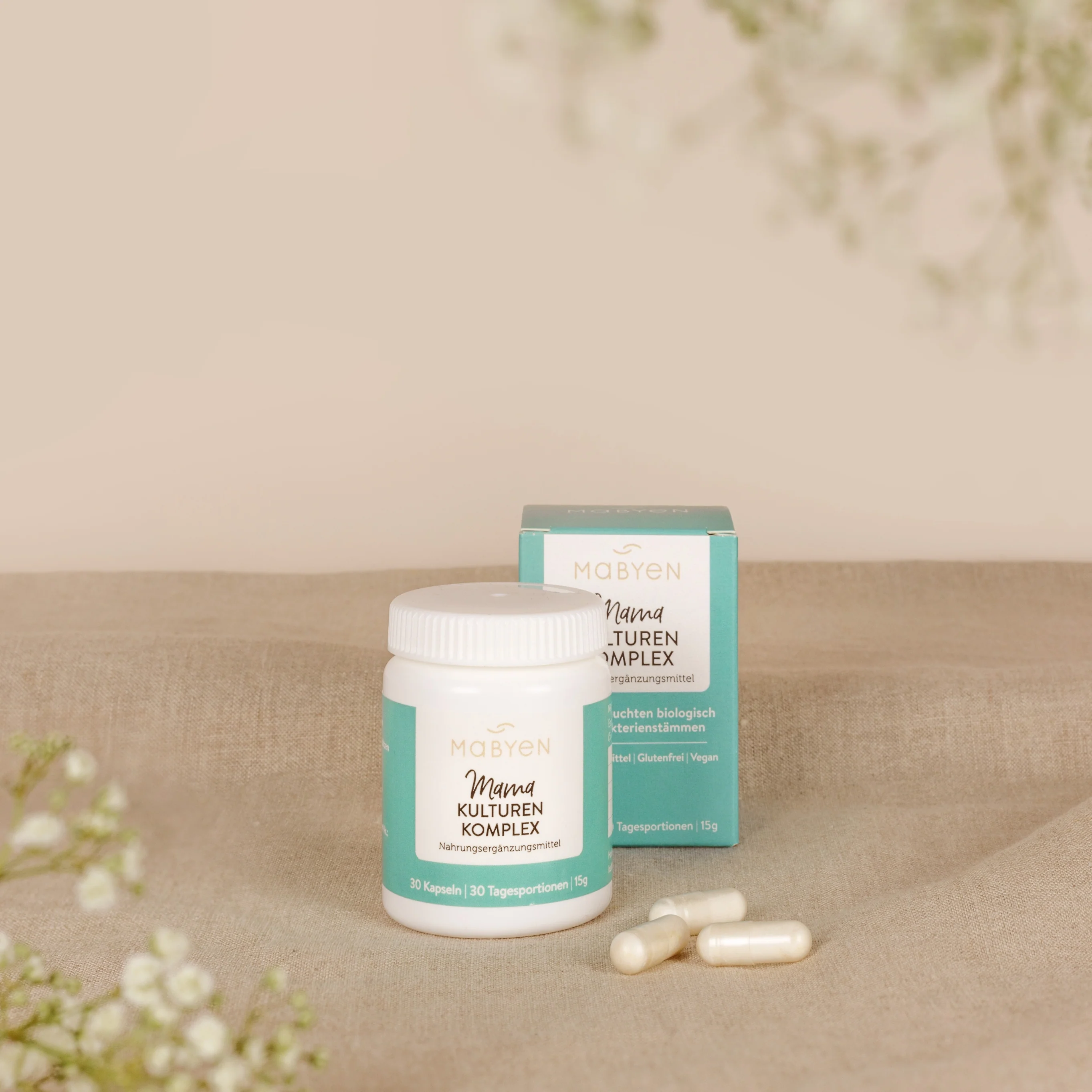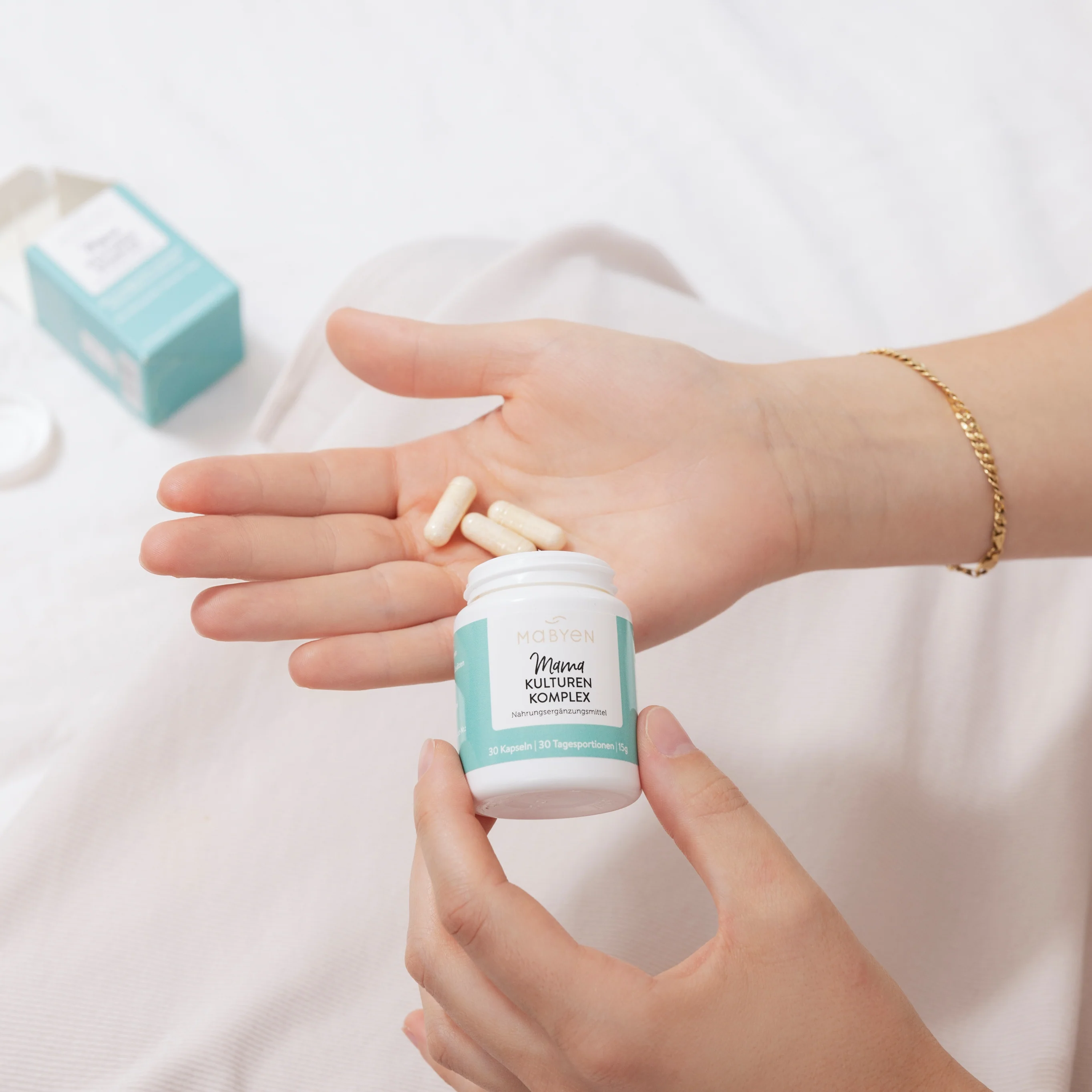 Okres ciąży, porodu i karmienia piersią to czas wyjątkowych wyzwań dla organizmu kobiety. MABYEN Mama Cultures Complex został stworzony, aby wspierać Cię w tym szczególnym okresie – codziennie, dyskretnie i skutecznie. Dzięki starannie dobranym, biologicznie aktywnym szczepom bakterii kapsułki wspomagają równowagę jelitową, trawienie oraz ogólne samopoczucie, a dodatkowe korzyści dla Twojego organizmu pozwalają poczuć się pewniej w każdej fazie macierzyństwa.
