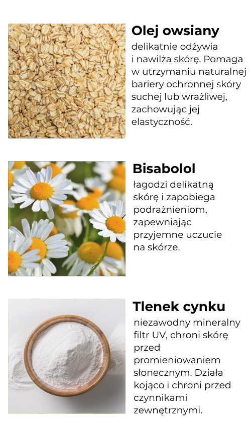 Aqua (woda), Zinc Oxide (tlenek cynku), Coco-Caprylate/Caprate (ester kokosowy, emolient), Polyglyceryl-6 Stearate (emulgator), Coco-Caprylate (lekki emolient), Polyhydroxystearic Acid (stabilizator), Polyglyceryl-3 Stearate/Sebacate (emulgator), Sorbitan Caprylate (emulgator), Avena Sativa Kernel Oil (olej z ziaren owsa), Glycerin (gliceryna – substancja nawilżająca), Cetearyl Alcohol (alkohol tłuszczowy, emolient), Ethyl Ferulate (antyoksydant), Bisabolol (substancja łagodząca), Glyceryl Stearate (emulgator), Polyglyceryl-6 Behenate (emulgator), Xanthan Gum (substancja zagęszczająca), Benzyl Alcohol (konserwant), Citric Acid (regulator pH), Tocopherol (witamina E, antyoksydant), Helianthus Annuus Seed Oil (olej słonecznikowy); 99,2% składników pochodzenia naturalnego.
